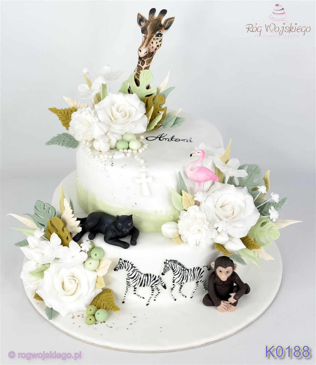 Wyjątkowy tort na pierwszą komunię z pięknymi kwiatami i uroczymi figurkami zwierząt safari. Słodki, kolorowy i pełen detali – idealny, aby uczynić ten dzień jeszcze bardziej niezapomnianym.