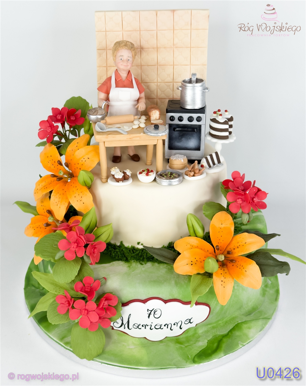 Wyjątkowy tort dla miłośniczki pieczenia! Na wierzchu figurka modelowana na podstawie zdjęć przy kuchence i stole z wałkiem i ciastem, a u podstawy delikatne lilie i pelargonie. Idealny pomysł na prezent dla osoby z talentem do słodkich wypieków.